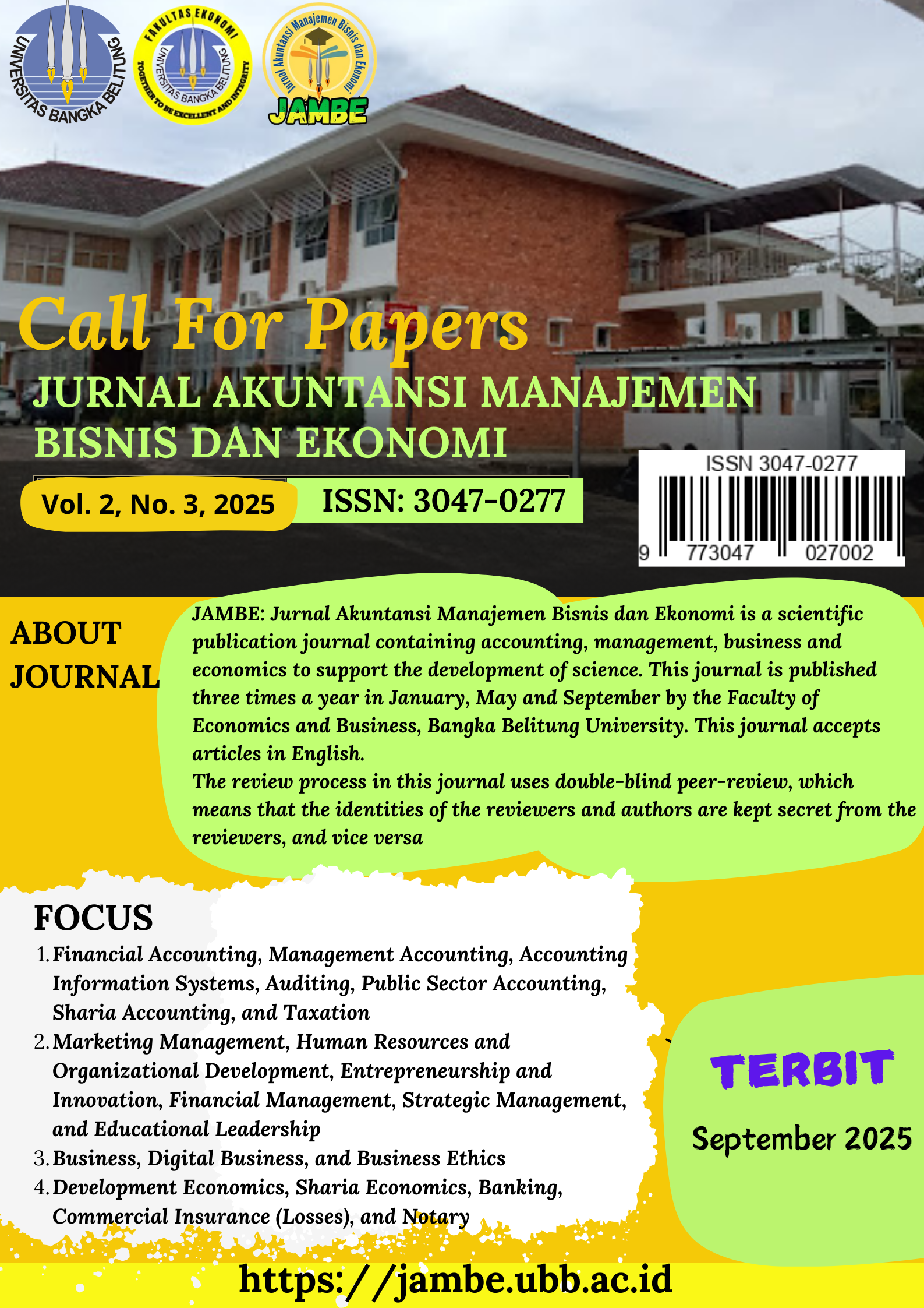 JAMBE: Jurnal Akuntansi Manajemen Bisnis dan Ekonomi is a scientific publication journal containing accounting, management, business and economics with registered number ISSN 3047-0277 to support the development of science. This journal is published three times a year in January, May and September by the Faculty of Economics and Business, Bangka Belitung University. This journal accepts articles in English.
